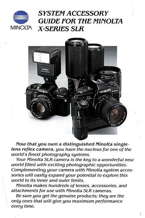 The Minolta brochure is a small fold-out detailing various accessories for the X-Series.