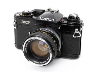 The EF debuted in 1973, and it filled the position under the F-1 and above the FTb. The F-1, of course was a true pro-level camera – rugged and flexible with tons of accessories. And the FTb was more of an entry-level offering for the time. But the EF is notable for being the only Canon FD body to make use of the Copal Square shutter. This shutter is vertically-traveling and allows a faster flash-sync speed of 1/125 sec. And even more interesting is that it’s a mechanical/electronic hybrid. The range of shutter speeds is 1/1000 sec down to a very-unusual-for-the-day 30-seconds. Speeds from ½ sec to 1/1000 sec are mechanical. But speeds from 1-sec to 30-secs are electronically controlled. This camera is also historically significant, in that it was the first Canon camera to offer shutter priority auto-exposure – a feature that they’d continue on their later AE-1 series.