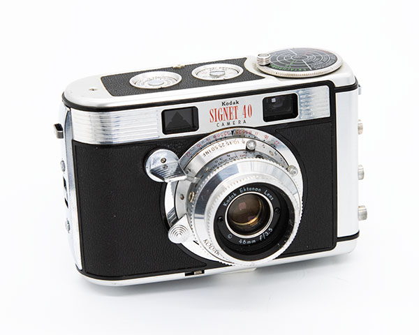 The second camera in the series is the Signet 40. Produced from 1956-1959, it’s also a rangefinder design, but is built mostly of Bakelite with a few metal panels. It features a 46mm f/3.5 Ektanar (not Ektar) lens in a Kodak Synchro 400 shutter. The speed range is ⅕ to 1/400 second plus B. Its price upon release in 1956 was $65 USD – about $775 USD in today’s money. And the 40 definitely has the best shutter speed range of the entire lot.