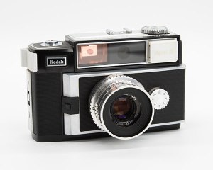 The third camera in the series is the Signet 30. It was produced from 1957-1959 and has a 44mm f/2.8 Ektanar lens in a Kodak Synchro 250 shutter. Shutter speeds are ¼ to 1/250 second plus B. And the camera is mostly Bakelite construction. The 30 looks like a rangefinder, but it’s only a viewfinder camera. And when it was released in 1957, it was priced at $55 USD – equivalent to about $635 USD today.