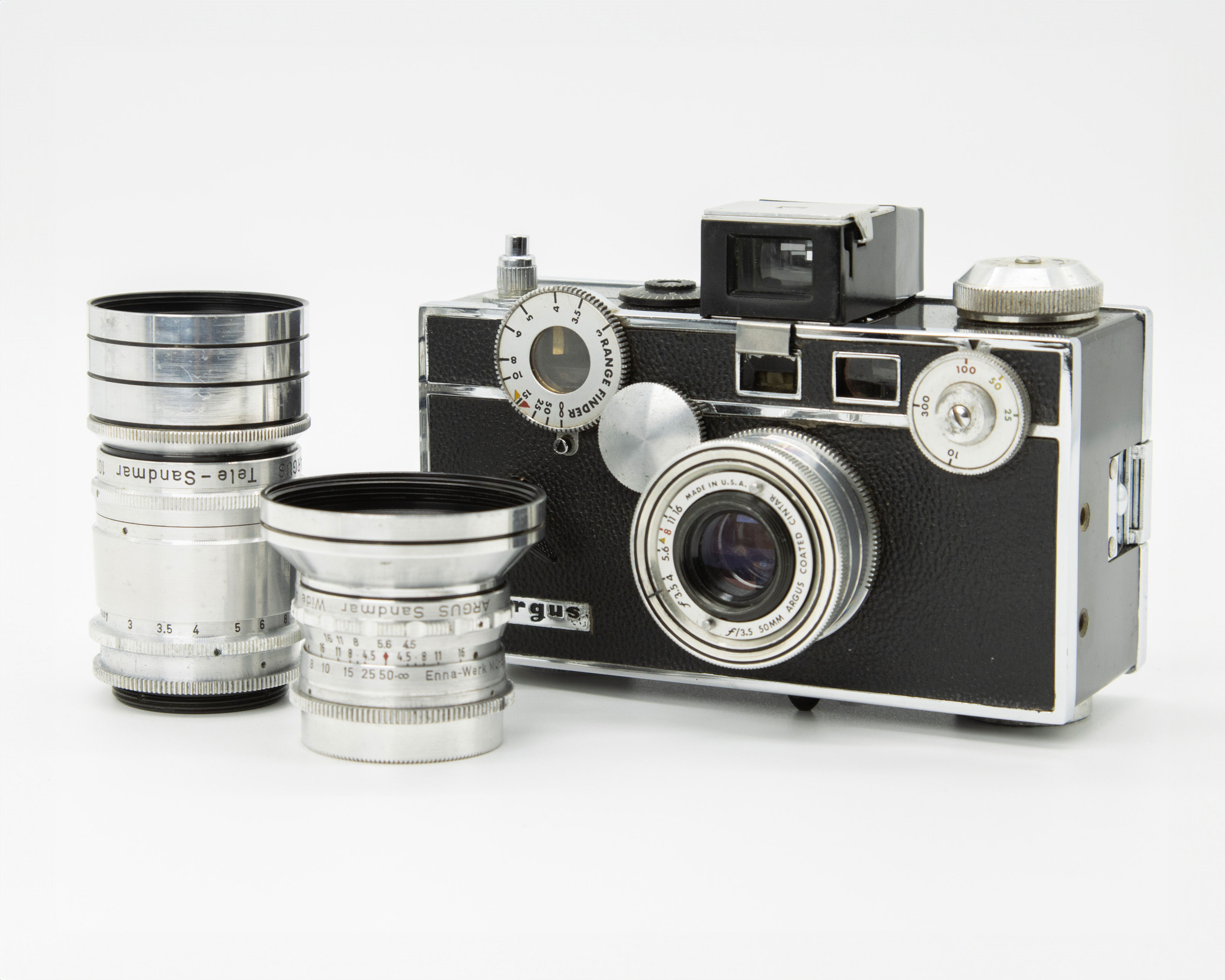 The two additional lenses were NOT made in the US. Both of these were manufactured in Germany by Enna-Verk. We have a 35mm 4.5 Sandmar wide-angle. And a 100mm 4.5 Tele-Sandmar. Both are coated anastigmat designs just like the standard 50 AND have 9-bladed diaphragms as well.