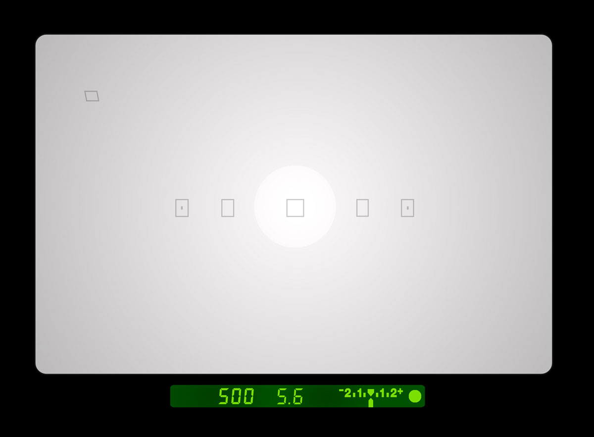 Finder: shutter speed, aperture, metering info, focus confirmation, flash ready-light, metering pattern
