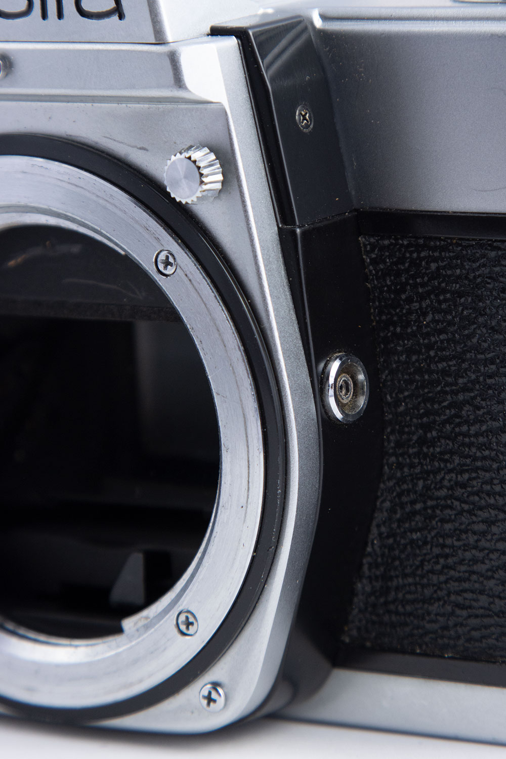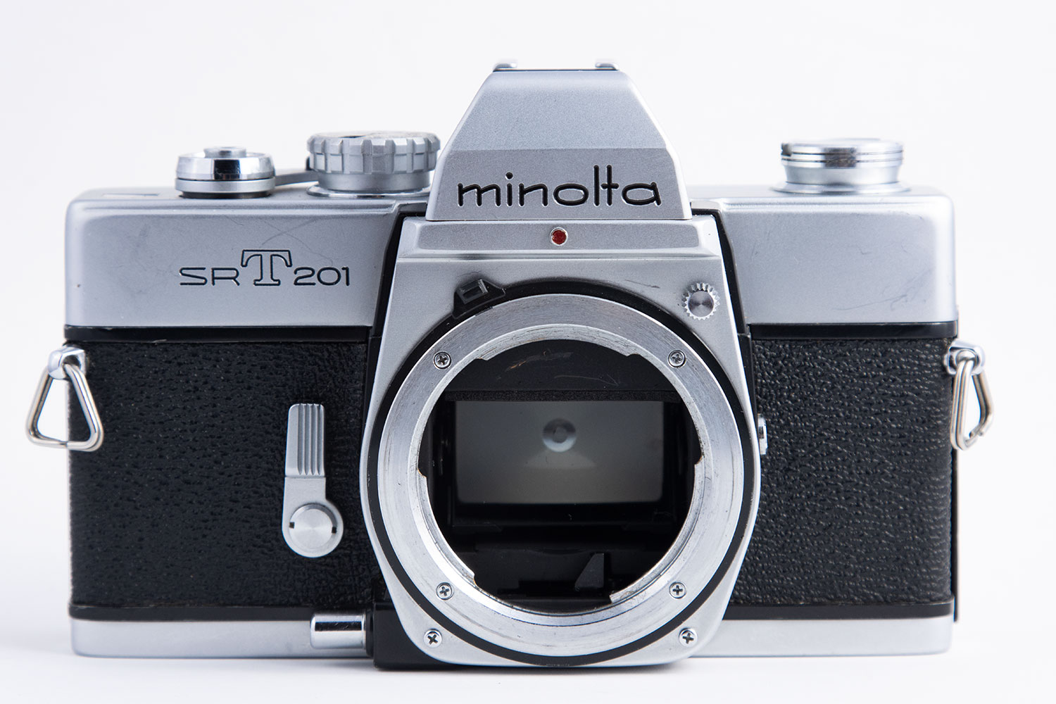 SR-T 101 First version identifiable by the black shutter speed dial. Later versions were silver. Note the cold shoe and mirror lock-up switch next to self timer. Has metal aperture setting ring.