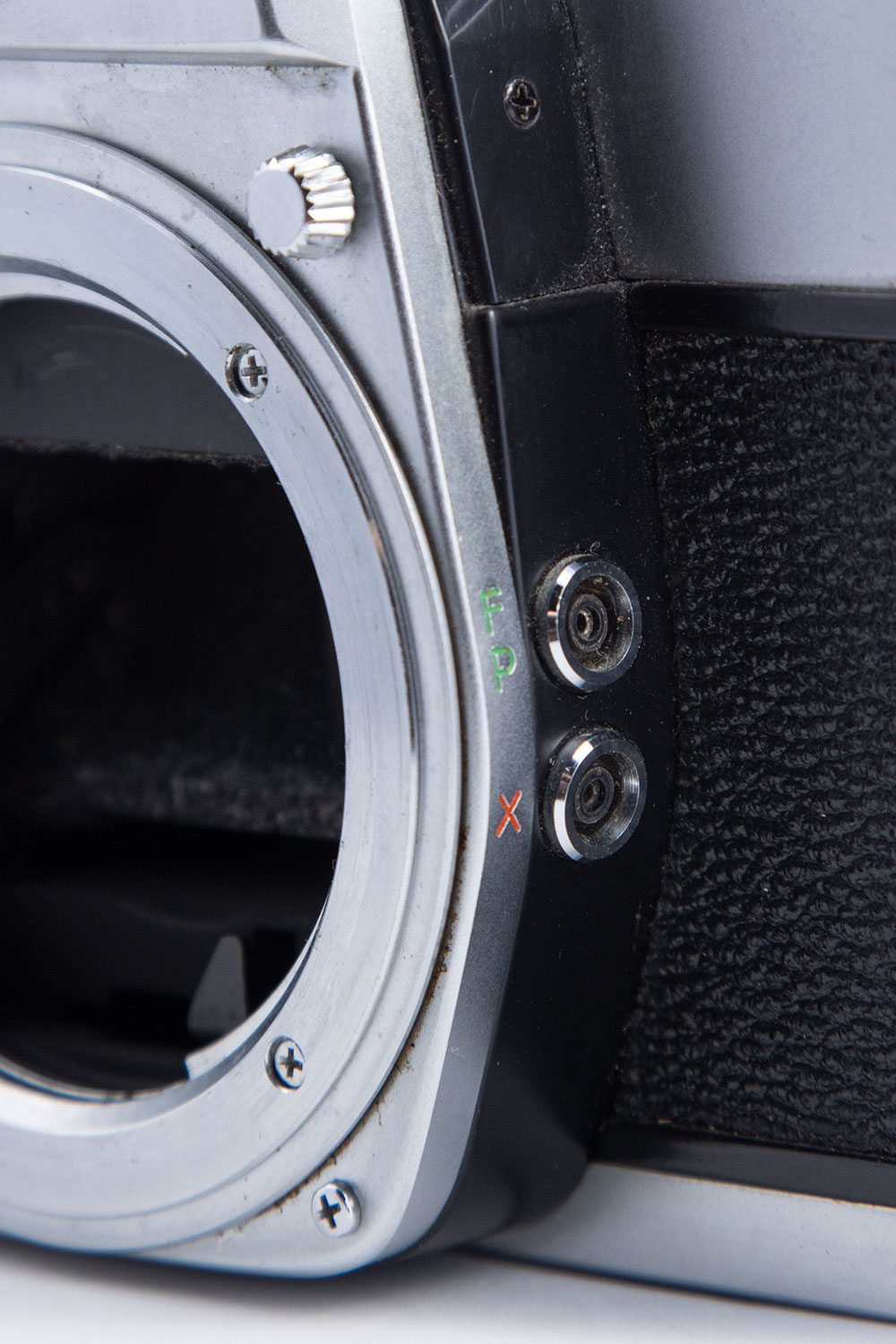 SR-T 102 Note silver shutter speed dial and hot shoe. Mirror lock-up beside the self timer switch. This specific copy has plastic aperture setting ring. I have another one that has a metal ring. Go figure.