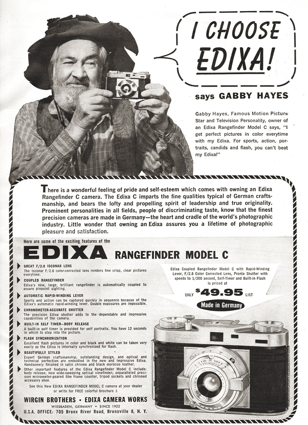 Vintage Photo Ads: Edixa Ads are arranged chronologically in descending order. Click on each ad for a high-resolution version. 1965 1956 1956 1956 Share this:Tweet Email a link to a friend (Opens in new window) Email Like Loading...