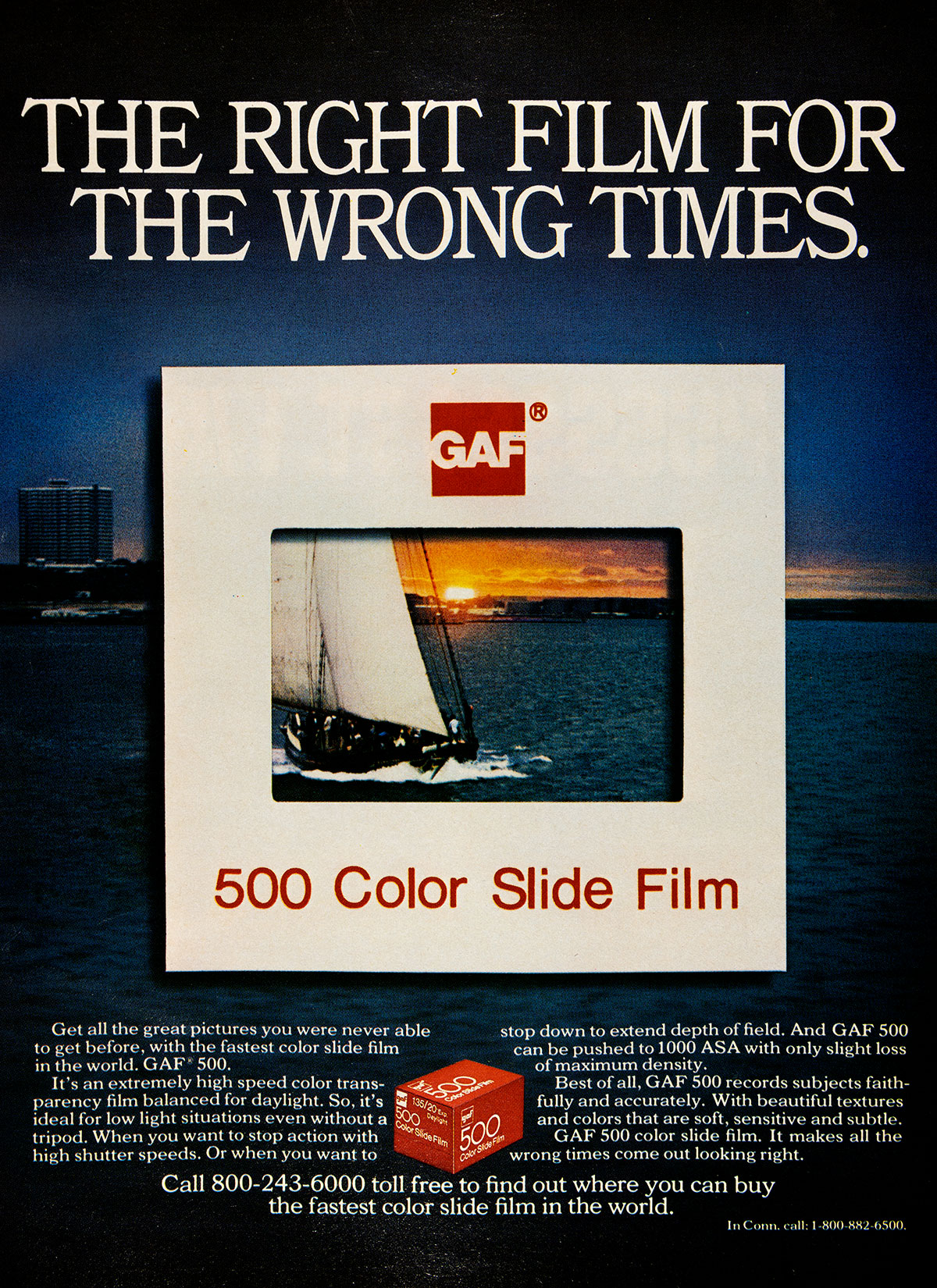 Vintage Photo Ads: GAF Ads are arranged chronologically in descending order. Click on each ad for a high-resolution version. 1975 1974 1971 Share this:Tweet Click to email a link to a friend (Opens in new window) Email Like Loading...
