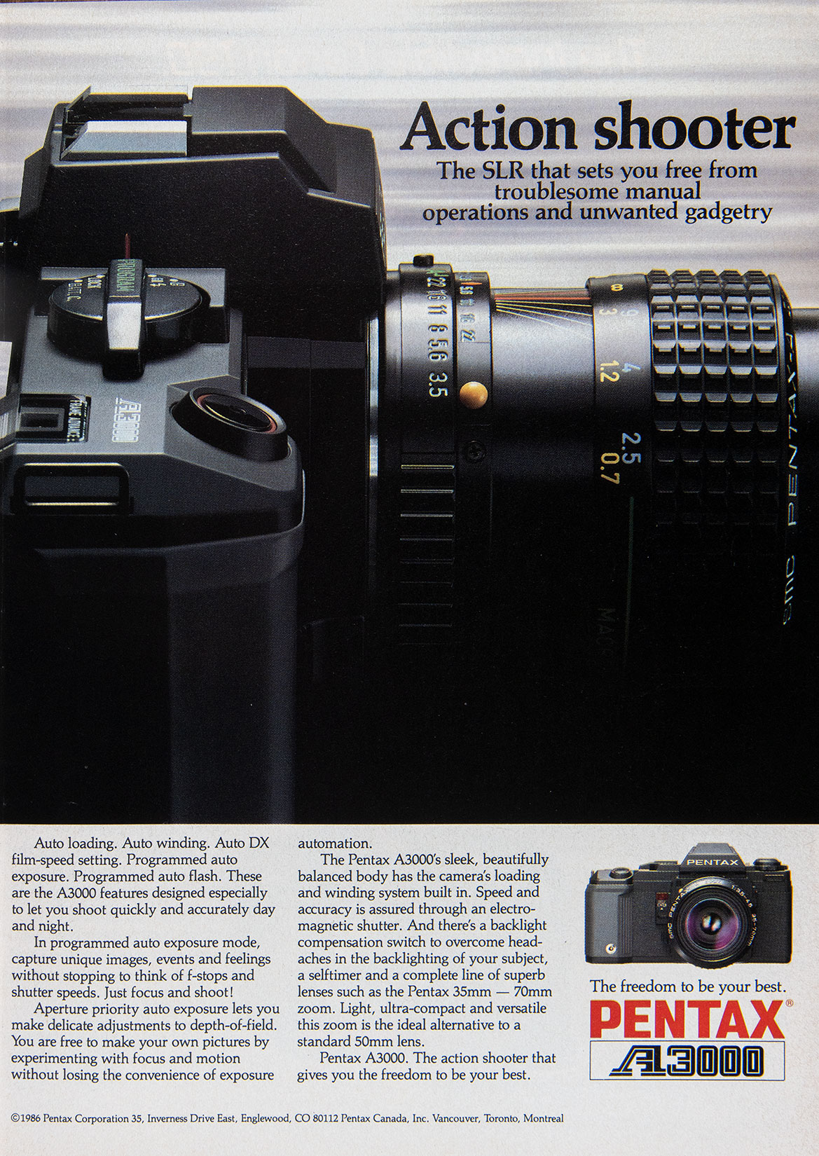 Vintage Photo Ads: Pentax 1980s Ads are arranged chronologically in descending order. Click on each ad for a high-resolution version. 1989 1989 1988 1988 1988 1987 1987 1986 1986 1986 1986 1985 1984 1983 1982 1982 1981 1980 1980 1980 1980 Share this:Tweet Click to email a link to a friend (Opens in new window) Email Like Loading...