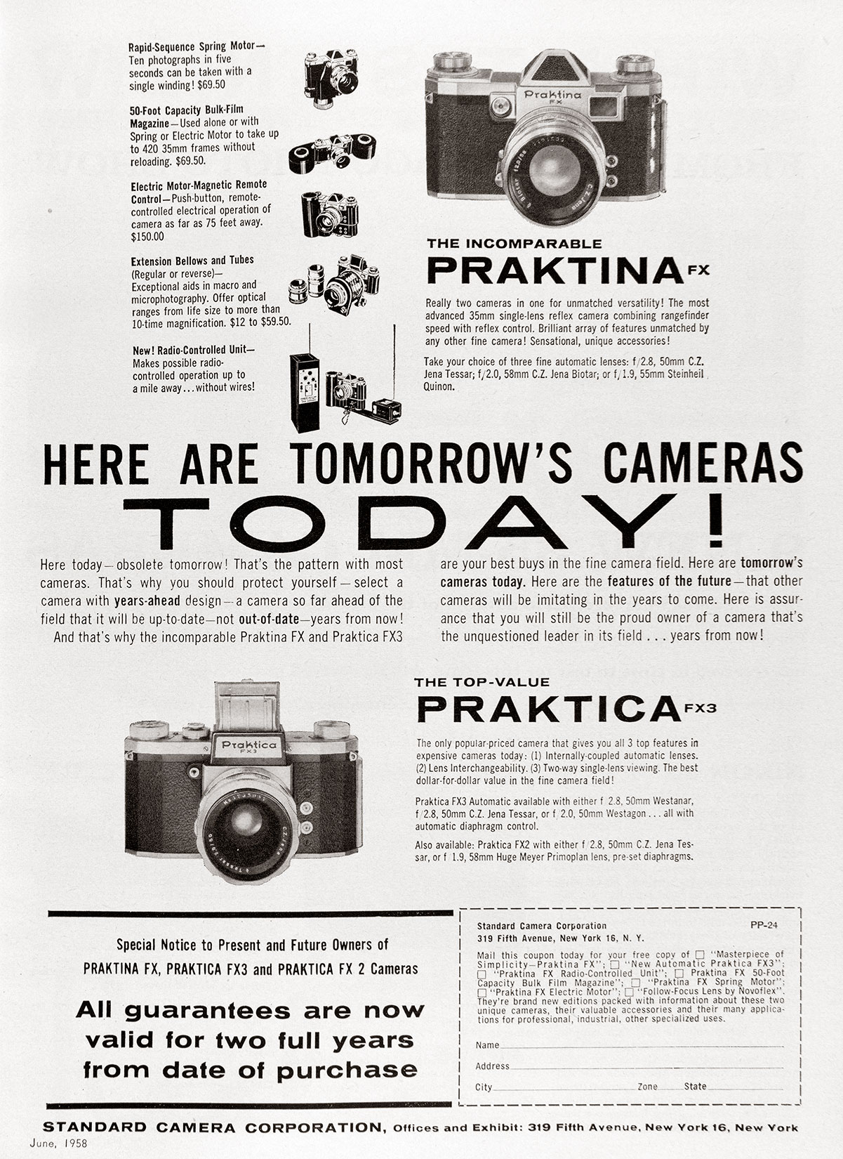 Vintage Photo Ads: Praktica Ads are arranged chronologically in descending order. Click on each ad for a high-resolution version. 1980s-90s 1990 1990 1970s 1975 1975 1974 1960s 1969 1964 1962 1960 1950s 1959 1958 1957 1957 Share this:Tweet Click to email a link to a friend (Opens in new window) Email Like Loading...