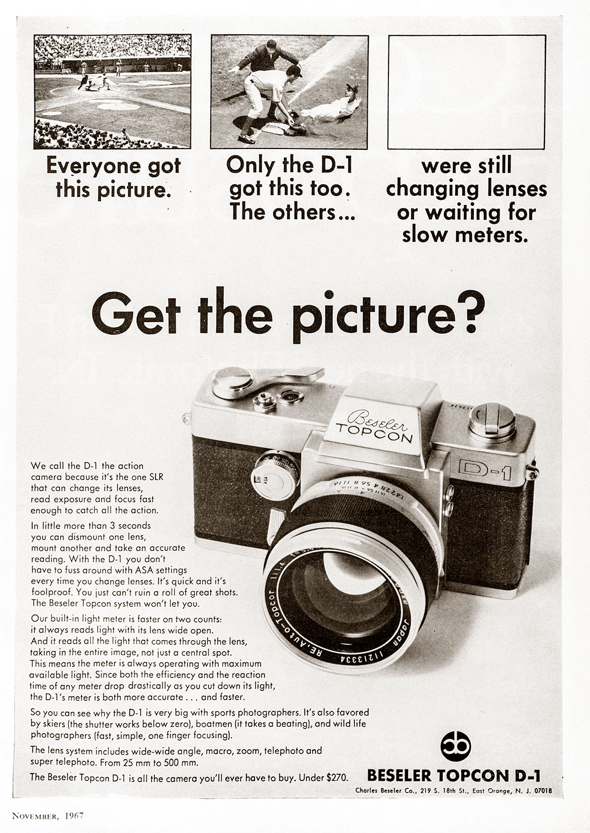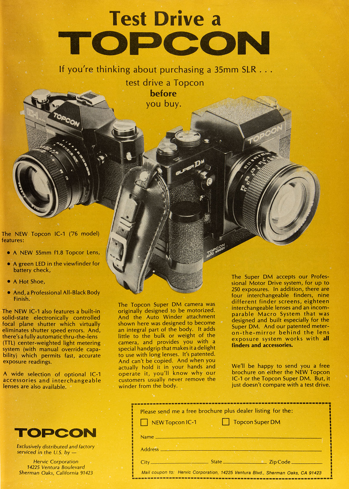 Vintage Photo Ads: Topcon Ads are arranged chronologically in descending order. Click on each ad for a high-resolution version. 1978 1975 1970 1970 1970 1969 1968 1967 1966 1965 1960 Share this:Tweet Click to email a link to a friend (Opens in new window) Email Like Loading...